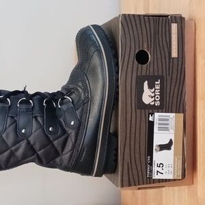 Warm and cozy black Sorel snow boots. Waterproof to keep your feet dry and lined with micro fleece. Stylish and comfortable. Features a faux fur trim, quilted sides, and a rubber tread sole. New, never worn and stored safely in their box. Ready for winter adventures! Size 7.5