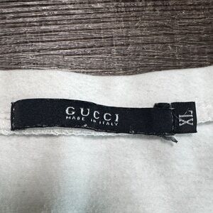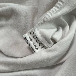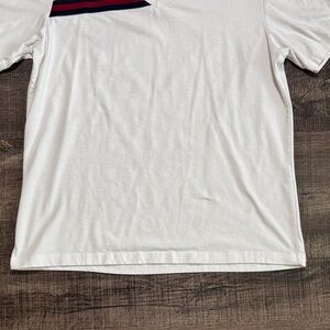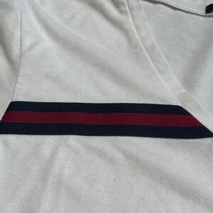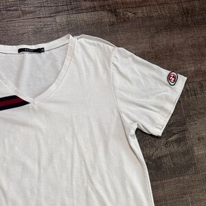 Stylish Gucci t-shirt. Features black and red stripe detail. Comfortable and casual design. Has a very light minor stain on the back of shirt , can be spot treated. No holes. Still in very good condition!