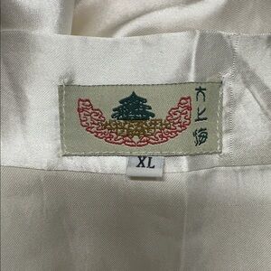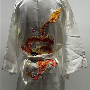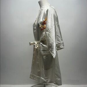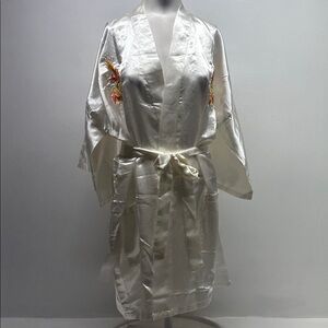 Bath Robe Belted Pockets Satin Silky Hand Embroidered Dragon Asian Ivory New XL