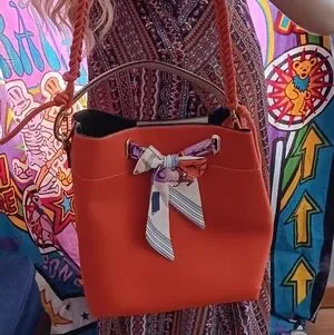 Chic orange shoulder bag with matching wallet and pouch. Features stylish rope handles and decorative scarf.