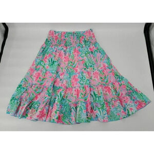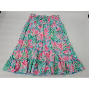Up for Consideration is this BRAND NEW WITH TAGS Lilly Pulitzer Deavan Midi Skirt Amalfi Blue Pink Green 'Leaf it Wild', Style 011146 in Size Large. It is Unlined, 100% Polyester, Machine Wash Cold Delicate Pictures are of actual item and also part of Description.