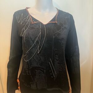 Edgy long sleeve top with artistic design. Features black base with white and orange accents. Ideal for stylish outings.