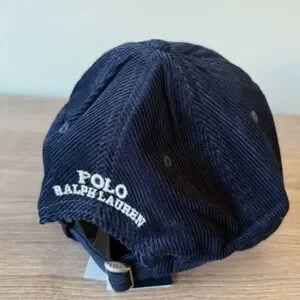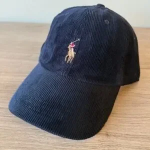 Classic navy corduroy hat. Features iconic Polo logo. Stylish and versatile.