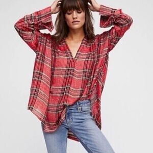 Free People Red and Black Plaid V-Neck Blouse extra large even tho tag says “med