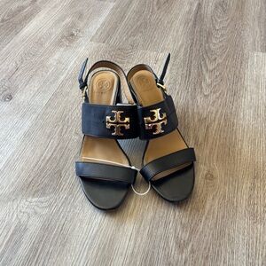 Tory Burch Everly Black and Gold Leather Block Sandals, 8