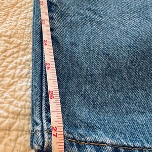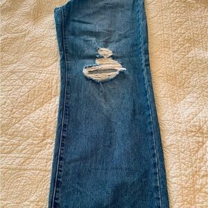 Great high rise, straight leg jeans. This pair features a medium wash, distressing at the knees (shown in photos), a 12” rise, straight leg, and a shorter ankle or capri length (27.5”).
