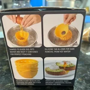 High-heat resistant silicone for easy cleaning. Convenient markings for water level. Funnel shape prevents yolk breakage. Hole pattern ensures even cooking.