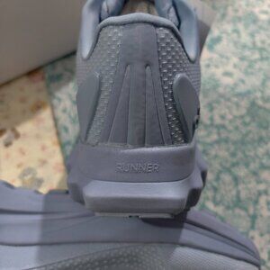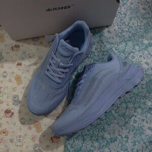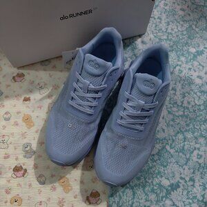 Blue mesh running shoes, lightweight with breathable mesh material, featuring the "alo" brand logo on the tongue and sides. Part of the alo RUNNER series, suitable for athletic wear.