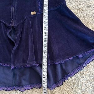 Size M purple velvet dress with a hood and flared sleeves, perfect for Renaissance fair or Elfin fashion. Beautiful laced hood, front zipper and lace hemmed flared skirts.