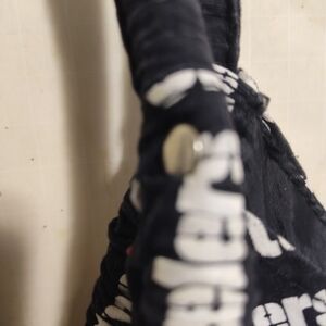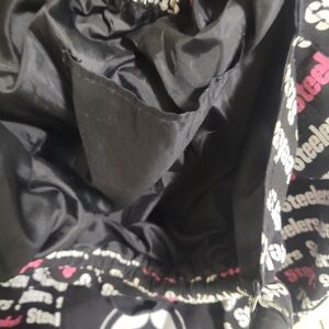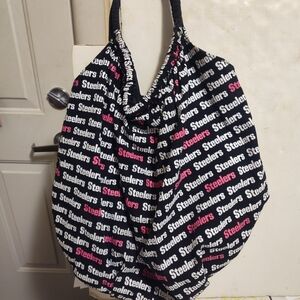 Steelers hobo handbag in pink, black and white logo pattern, black round double handles with 8" drop, black satin lining, 1 inner pocket and 1 outer pocket with Steelers logo. Measures 17" wide x 25" tall, expandable. Cotton fabric Pre- owned in good condition.