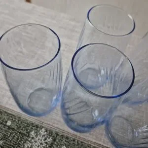 Modern drinking glasses with a glossy finish and a swirl pattern in a very light blue color. Dishwasher safe. These retro glasses are a unique and stylish choice for all occasions.
