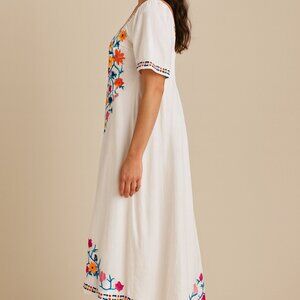 Beautiful SUNDANCE white boho maxi dress featuring colorful floral embroidery throughout. A relaxed, flowy silhouette that’s perfect for summer, vacations, beach outings, or bohemian-inspired looks.