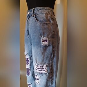 distressed jeans. tags and labels removed. pre-owned denim pants. purple print peek a boo patches. see all pictures. they are part of the description.
