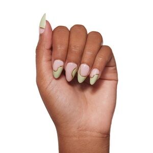 Glamnetic press-on nails with a nude base featuring a gorgeous light green and gold design. Short almond shape for a chic look.