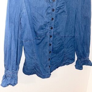 Free People ruched button front collared chambray blouse with ruffle elastic cuffs. Wide elastic detail on back. Size large