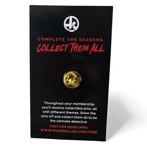 The pin is a Hunt A Killer Skull Worm enamel pin, a collectible item associated with the Hunt A Killer mystery subscription game. The design features a yellow/gold skull with a worm coming out of its mouth