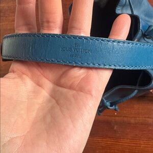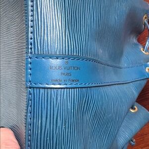 Authentic LV Epi Noe shoulder bag. Blue Epi leather, gold hardware. Good vintage condition. Some rubbing on bottom corners, slight discoloration in spots; please see pictures.