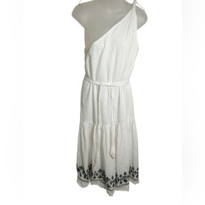 Roller Rabbit One Shoulder Embroidered Hem Dress White Boho Floral Midi Medium