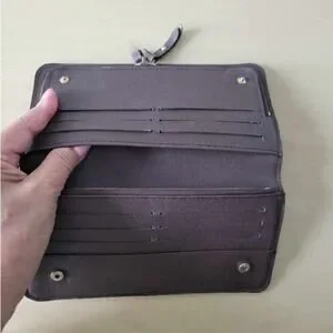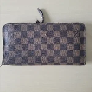 Stylish checkered snap brown wallet. There are a few flaws missing pull on zip pocket see picture. Smells like leather can not validate.