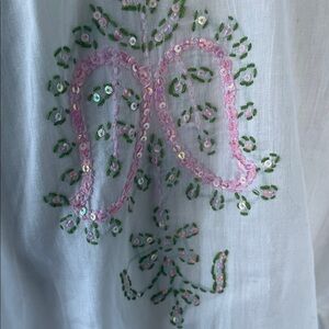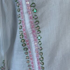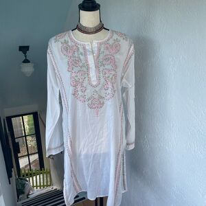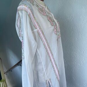 Elevate your style with this elegant white tunic, beautifully adorned with pink /green embroidery and beading. Perfect for any occasion. Lightweight cotton material long sleeves length is 35 inches and pit to pit measurement is 20 inches size medium. NWOT