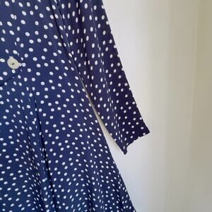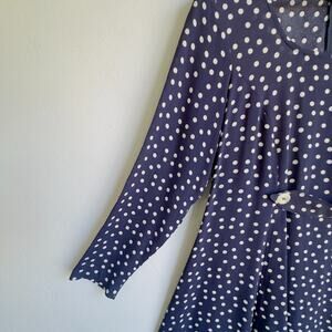 Betsey Johnson navy and white polka dot dress. Features A-line silhouette, knee length, long sleeves, and buttoned sash detail at waist. Flirty and retro chic.