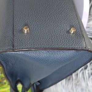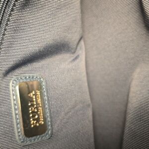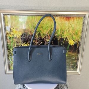 Furla Leather Shoulder Tote Dusty Blue Black Gold Logo 14x10 Excellent