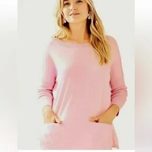 New with tags Lilly Pulitzer heathered pink tropics cool max light weight oversized sweater. 66% cotton, 34% polyester cool max. Pull over with metallic trim and sleeves and two front pockets. Has one small snag on front. See photo for measurements and flaw. Twee,balletcore, Barbiecore, soft girl, cottagecore, cleangirl,coquette, light academia