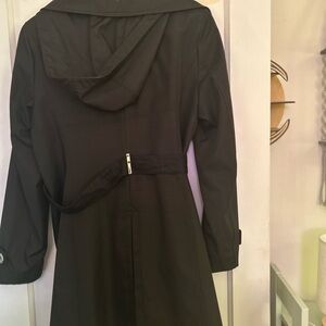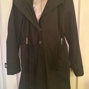 Sleek black trench coat by Calvin Klein. Features classic button closure, detachable hood, and belted waist.