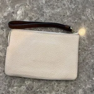 Elegant Coach wristlet in cream. Features a rainbow logo and brown strap.