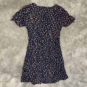 Madewell navy floral fit and flare dress with a button front design and flattering V-neckline. This short sleeve Madewell dress features a defined waist and flowy skirt, making it perfect for spring and summer wear, work, brunch, or casual outings. Easily styled with sandals for warm weather or boots and a cardigan for fall and winter. Lightweight and comfortable in like new condition.