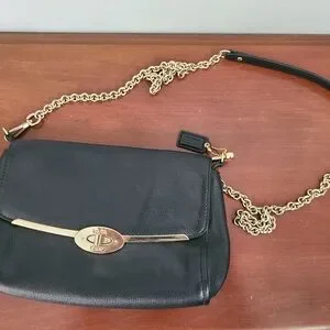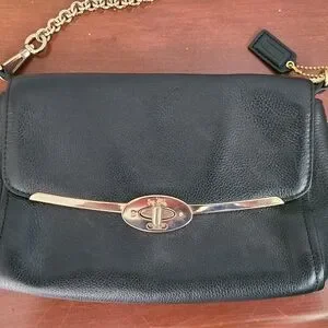 Coach crossbody in black pebbled leather with gold hardware and a chain + leather strap. The bag features a classic turnlock closure and a versatile size perfect for daily use or evenings out.
