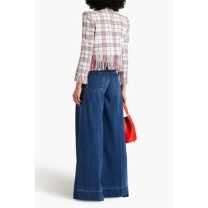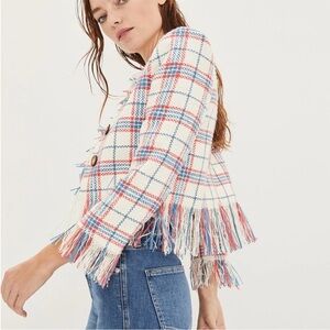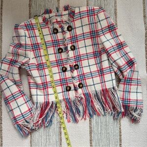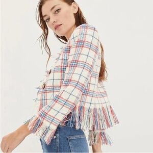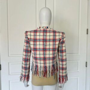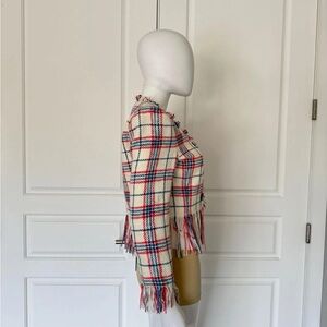 Veronica Beard Marlton White Blue Red Plaid Tweed Fringe Blazer Jacket