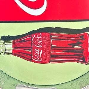 Vintage-style Coca-Cola serving tray. Features classic red and green design with logo. Perfect for collectors or serving drinks.
