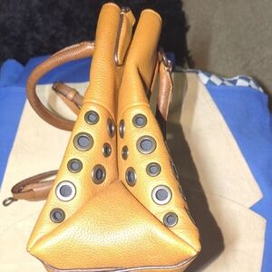 Authentic Coach soft borough satchel in rich brown pebbled leather with grommets.Features black circular accents. Includes matching strap for versatility. Excellent pre-owned condition. Small weAr and tear on one of the corners of the bag (see photo).