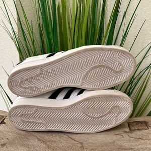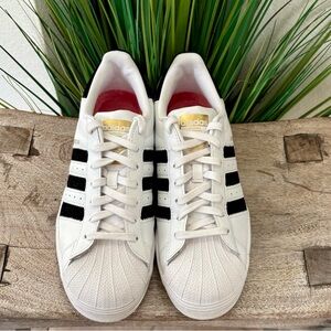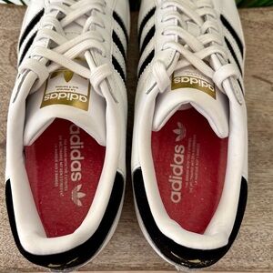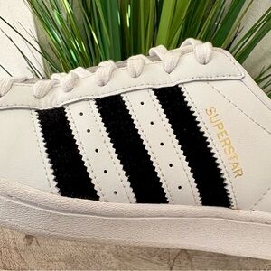 Adidas originals superstar heart logo white and black sneakers. With black shimmery velvet stripes on the sides and velvet on the back. Size 8.5 In good condition. Lace up closure. Please see all photos for any details.