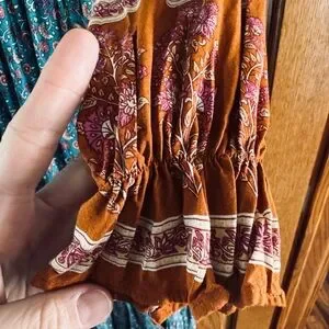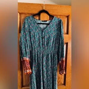 Elegant floral dress featuring a vibrant green and orange pattern. Perfect for any occasion.