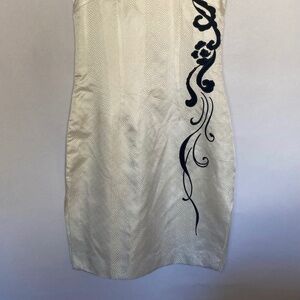 EUC Embroidered Cocktail Party Dress with Mandarin Swan Neckline Collar, XL creamy white patterned fabric with black embroidered velvet design on front. Zipper works well, as shown in photo. In excellent condition without any signs of wear. Sleeveless and falls just below knee length for a midi style. Semi formal or cocktail dress. When laid flat, this dress measures 17” from pit to pit, the waist is 14.5” across and the length is 38” from the top of the back collar to the hem.