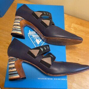 With each season comes Greater Expectations from our loving community of Fluevogers and we wouldn’t have it any other way. In praise of some of our best friends and fans, John and the design team are pleased to present a family of sensible heels with soft, unstructured uppers. A cool, geometrically infused mary jane with double straps and a leather wrapped 2.5" heel, The Pettitt is named after a passionate, outspoken Fluevoger who inspires many. Let’s have greater expectations.