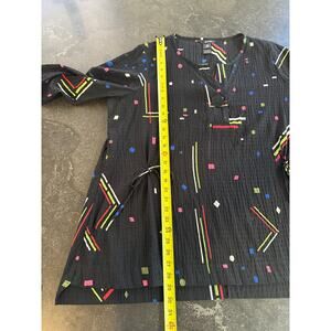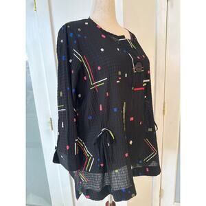 Ali Miles Black Multicolor Geometric Popover Crinkle Blouse Top Button Detail Size 1X