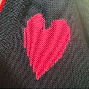 Stylish navy blue cardigan with vibrant heart designs. Features gold buttons and red trim. Ideal for a playful touch. Size Mp. I’m between an S and an M and it fits perfectly.