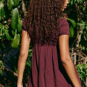 Free People Twiggy Mini Dress. Size small. Color listed is Decadent, which is a burgundy brownish color. Non-smoking, dog-loving home. Per site description: So sweet with undeniable retro charm, this breezy babydoll mini from free-est features a smocked bust, short puffed sleeves, and a ruffled mock neckline for all the femme feels. Pockets.