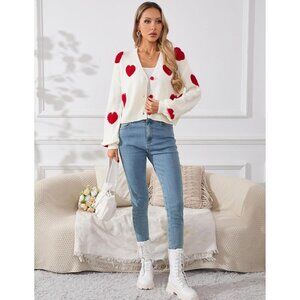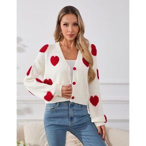 Features: Lightweight, textured knit with adorable red heart patterns. Cropped design with a relaxed fit, featuring a V-neck and button closure. Puffed long sleeves add a trendy touch — great for layering or wearing alone.