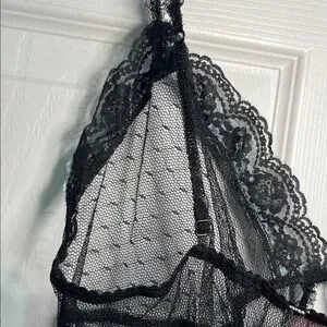 Victoria’s Secret Sheer Black Babydoll with Blue Lace Trim. Stunning and unique! Gorgeous sheer mesh with exquisite lease trim and soft blue accents. Satin blue bowtie in the center with a split open front. Seems under the cups but sheer throughout. Lace over the shoulder straps with a sliding adjustable piece. Beautiful lace hemline.Worn once and like new. Measures 29 inches long with adjustable length straps for more options, and 18.5 inches pit to pit.