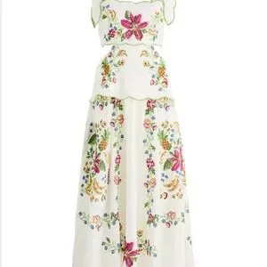 Elegant floral embroidered maxi dress in cream with vibrant multicolor accents. Perfect for any occasion.