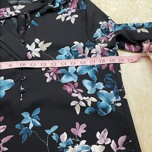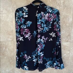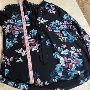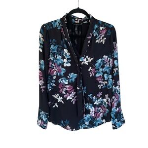 White House Black Market Blouse 4 Floral Tie Neck Women’s Black Blue Long Sleeve
