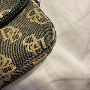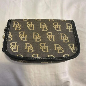 GUC. Clutch in classic D&B design, a dark gray and cream patterned fabric accented by black leather. Detachable strap. A little edge wear as photographed.