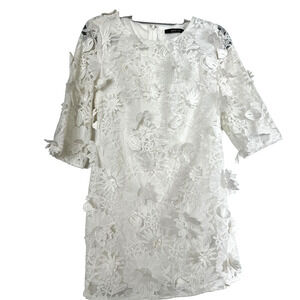 The Ark & Company Floral Lace White Dress in size Small is a stylish and versatile piece perfect for various occasions. Made from a comfortable polyester and cotton blend, this dress features a charming floral pattern on lace fabric, with a crew neck and 3/4 sleeves adding a touch of elegance. The tailored fit and short length make it a flattering silhouette, while the zip closure and button accents add a unique touch. Whether for a party, cocktail event, or casual outing, this dress is a must-have for any fashion-forward woman.