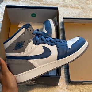 Classic Air Jordan 1 with a bold blue and grey colorway. Perfect for style and comfort. Worn twice. Also comes with the white shoe laces that they originally came with.
