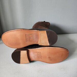 "LIKE NEW" Super Cute Brown Pebbled Leather & Canvas Tall Riding Boots By Frye. Pull on Style, Leather Foot/Shoe with Leather Strap & Buckle Accent at Top, Cushioned Foot Bed & Almond Toe, Logo Embossing, Low 1" Stacked Heel with Leather Soles, Made in Mexico, 15.5" Tall from Arch & 16" Circumference at Top, Like New, Never Worn, Only Tried On, Minor Markings Normal Retail Environment & Storing:) Rt.245.00 approx. Size 6, Foot Bed Measures approx. 9.5" *Equestrian Look/Style.