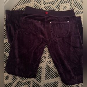 Luxurious purple velour track pants and jacket set. Features a sparkling rhinestone heart detail. Comfortable and stylish.